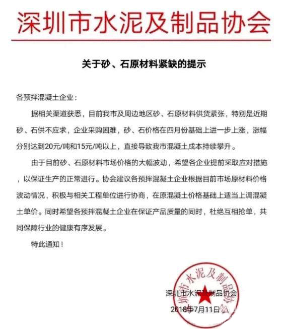 7月11日深圳水泥及制品協(xié)會(huì)發(fā)布關(guān)于砂、石原材料緊缺的提示,提示稱據(jù)相關(guān)渠道獲悉,深圳及周邊地區(qū)砂、石原材料供貨緊張,特別是近期砂、石供不應(yīng)求,企業(yè)采購困難,砂、石價(jià)格在四月份基礎(chǔ)上進(jìn)一步上漲,漲幅分別達(dá)到20元/噸和15元/噸以上,直接導(dǎo)致深圳市混凝土成本持續(xù)攀升。由于目前砂、石原材料市場價(jià)格的大幅波動(dòng),協(xié)會(huì)希望各企業(yè)提前采取對(duì)應(yīng)措施,以保證生產(chǎn)的正常進(jìn)行。協(xié)會(huì)建議各預(yù)拌混凝土企業(yè)根據(jù)目前市場原材料價(jià)格波動(dòng)情況,積極與相關(guān)工程單位進(jìn)行協(xié)商,在原混凝土價(jià)格基礎(chǔ)上適當(dāng)上調(diào)混凝土單價(jià)。希望各預(yù)拌混凝土企業(yè)在保證產(chǎn)品質(zhì)量的同時(shí),杜絕互相搶單,共同保障行業(yè)的健康有序發(fā)展。