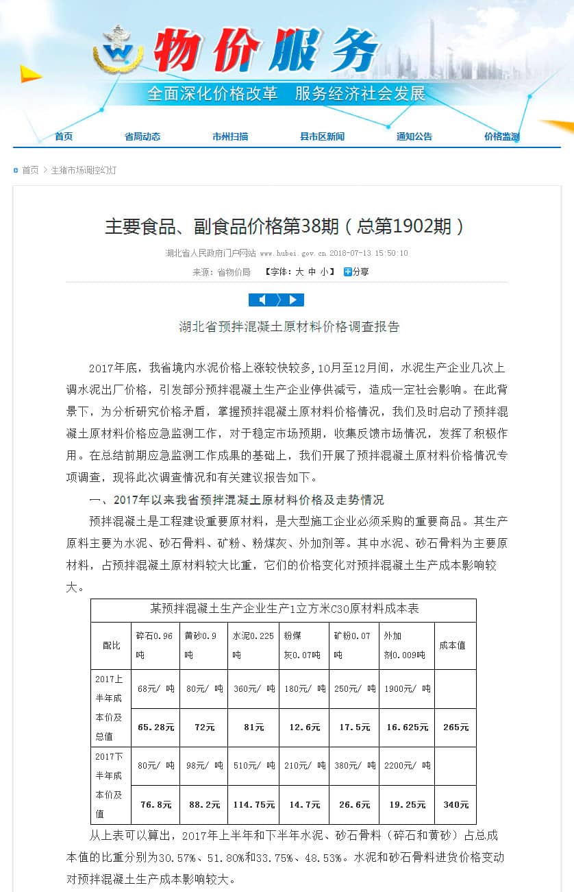 2018年7月13日,湖北省人民政府網(wǎng)站發(fā)布《湖北省預(yù)拌混凝土原材料價(jià)格調(diào)查報(bào)告》,報(bào)告稱2017年底,湖北省境內(nèi)水泥價(jià)格上漲較快較多,10月至12月間,水泥生產(chǎn)企業(yè)幾次上調(diào)水泥出廠價(jià)格,引發(fā)部分預(yù)拌混凝土生產(chǎn)企業(yè)停供減虧,造成一定社會(huì)影響。