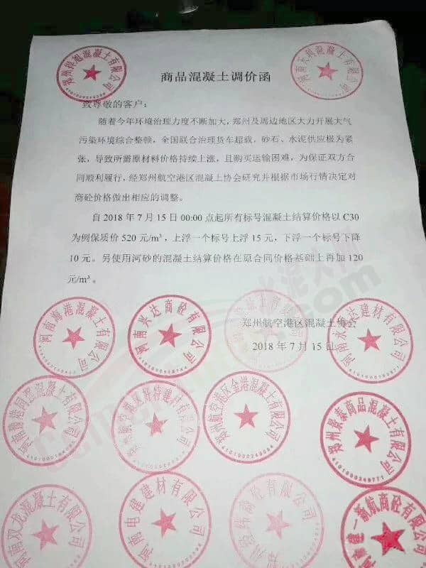 日前,鄭州航空港區(qū)混凝土協(xié)會(huì)十四家商混企業(yè)集體發(fā)布商品混凝土調(diào)價(jià)函稱,隨著今年環(huán)境治理力度不斷加大,鄭州及周邊地區(qū)大力開展大氣污染環(huán)境綜合整頓,全國(guó)聯(lián)合治理貨車超載,砂石、水泥供應(yīng)極為緊張,導(dǎo)致所需原材料價(jià)格持續(xù)上漲,且購(gòu)買運(yùn)輸困難,為保證雙方合同順利履行,經(jīng)鄭州航空港區(qū)混凝土協(xié)會(huì)研究并根據(jù)市場(chǎng)行情決定對(duì)商砼價(jià)格做出相應(yīng)的調(diào)整。