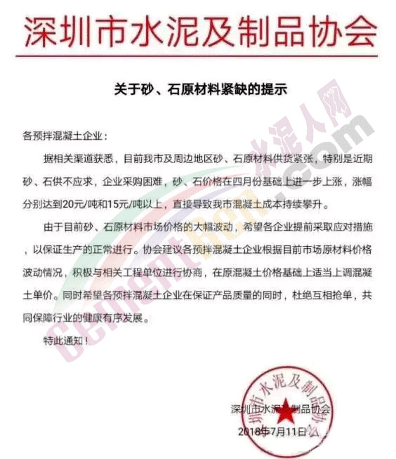 7月11日深圳水泥及制品協(xié)會(huì)發(fā)布關(guān)于砂、石原材料緊缺的提示,提示稱據(jù)相關(guān)渠道獲悉,深圳及周邊地區(qū)砂、石原材料供貨緊張,特別是近期砂、石供不應(yīng)求,企業(yè)采購(gòu)困難,砂、石價(jià)格在四月份基礎(chǔ)上進(jìn)一步上漲,漲幅分別達(dá)到20元/噸和15元/噸以上,直接導(dǎo)致深圳市混凝土成本持續(xù)攀升。由于目前砂、石原材料市場(chǎng)價(jià)格的大幅波動(dòng),協(xié)會(huì)希望各企業(yè)提前采取對(duì)應(yīng)措施,以保證生產(chǎn)的正常進(jìn)行。協(xié)會(huì)建議各預(yù)拌混凝土企業(yè)根據(jù)目前市場(chǎng)原材料價(jià)格波動(dòng)情況,積極與相關(guān)工程單位進(jìn)行協(xié)商,在原混凝土價(jià)格基礎(chǔ)上適當(dāng)上調(diào)混凝土單價(jià)。希望各預(yù)拌混凝土企業(yè)在保證產(chǎn)品質(zhì)量的同時(shí),杜絕互相搶單,共同保障行業(yè)的健康有序發(fā)展。