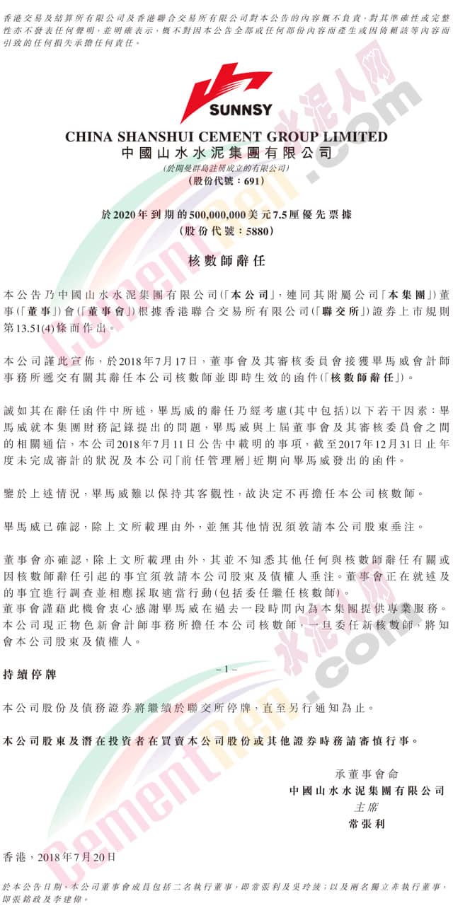 【水泥人網(wǎng)】山水水泥(00691.HK)宣布,于2018年7月17日,董事會及審核委員會接獲畢馬威會計(jì)師事務(wù)所遞交有關(guān)辭任公司核數(shù)師并即時(shí)生效的函件。