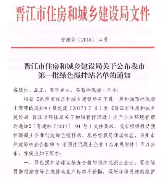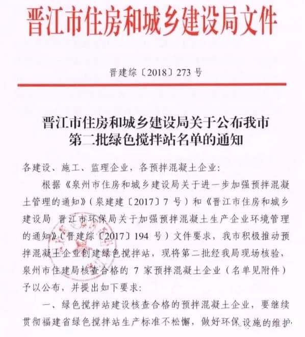 晉江市住建局在公布第二批綠色攪拌站名站通知時提出幾點要求: