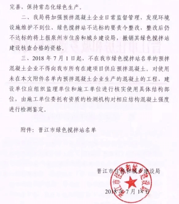 據(jù)了解,除公布名單的16家綠色攪拌站外,自2018年起,不在名單內(nèi)的預(yù)拌混凝土企業(yè)將不得向晉江市政府投資項目提供預(yù)拌混凝土。2018年7月1日起,不在晉江市綠色攪拌站名單內(nèi)的預(yù)拌混凝土企業(yè)不得向全市所有在建項目供應(yīng)預(yù)拌混凝土。