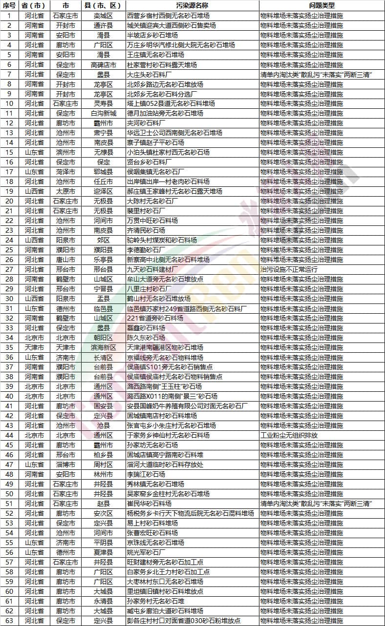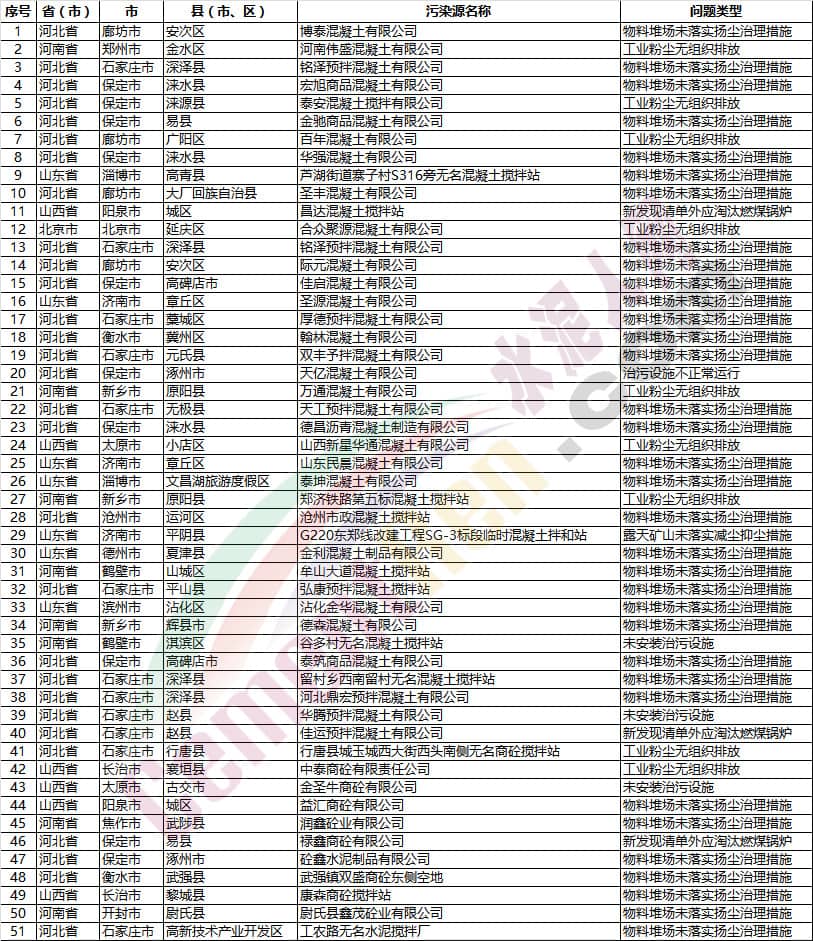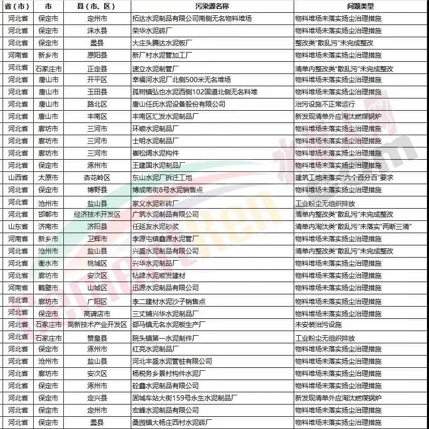 【水泥人網(wǎng)】7月份,2018-2019年藍(lán)天保衛(wèi)戰(zhàn)重點區(qū)域強(qiáng)化督查工作繼續(xù)開展,200個督查組按照工作方案要求,對京津冀及周邊地區(qū)204個縣(市、區(qū))進(jìn)行督查。發(fā)現(xiàn)多個涉氣環(huán)境問題,其中涉及水泥企業(yè)、混凝土(商砼)企業(yè)、砂石企業(yè)的如下: