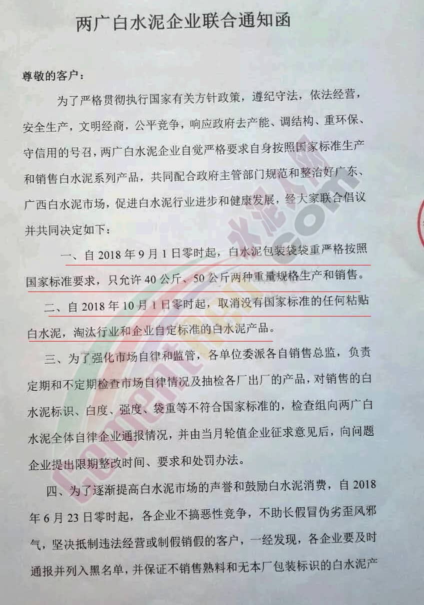 四、為了逐漸提高白水泥市場(chǎng)的聲譽(yù)和鼓勵(lì)白水泥消費(fèi),自2018年6月23日零時(shí)起,各企業(yè)不搞惡性競(jìng)爭(zhēng),不助長(zhǎng)假冒偽劣歪風(fēng)邪氣,堅(jiān)決抵制違法經(jīng)營(yíng)或制假銷假的客戶,一經(jīng)發(fā)現(xiàn),各企業(yè)要及時(shí)通報(bào)并列入黑名單,并保證不銷售熟料和無本廠包裝標(biāo)識(shí)的白水泥產(chǎn)品給這些企業(yè)和個(gè)人,發(fā)現(xiàn)觸犯法律的要及時(shí)報(bào)告政府主管部門處理,以便逐漸凈化白水泥市場(chǎng),促進(jìn)白水泥行業(yè)健康發(fā)展。