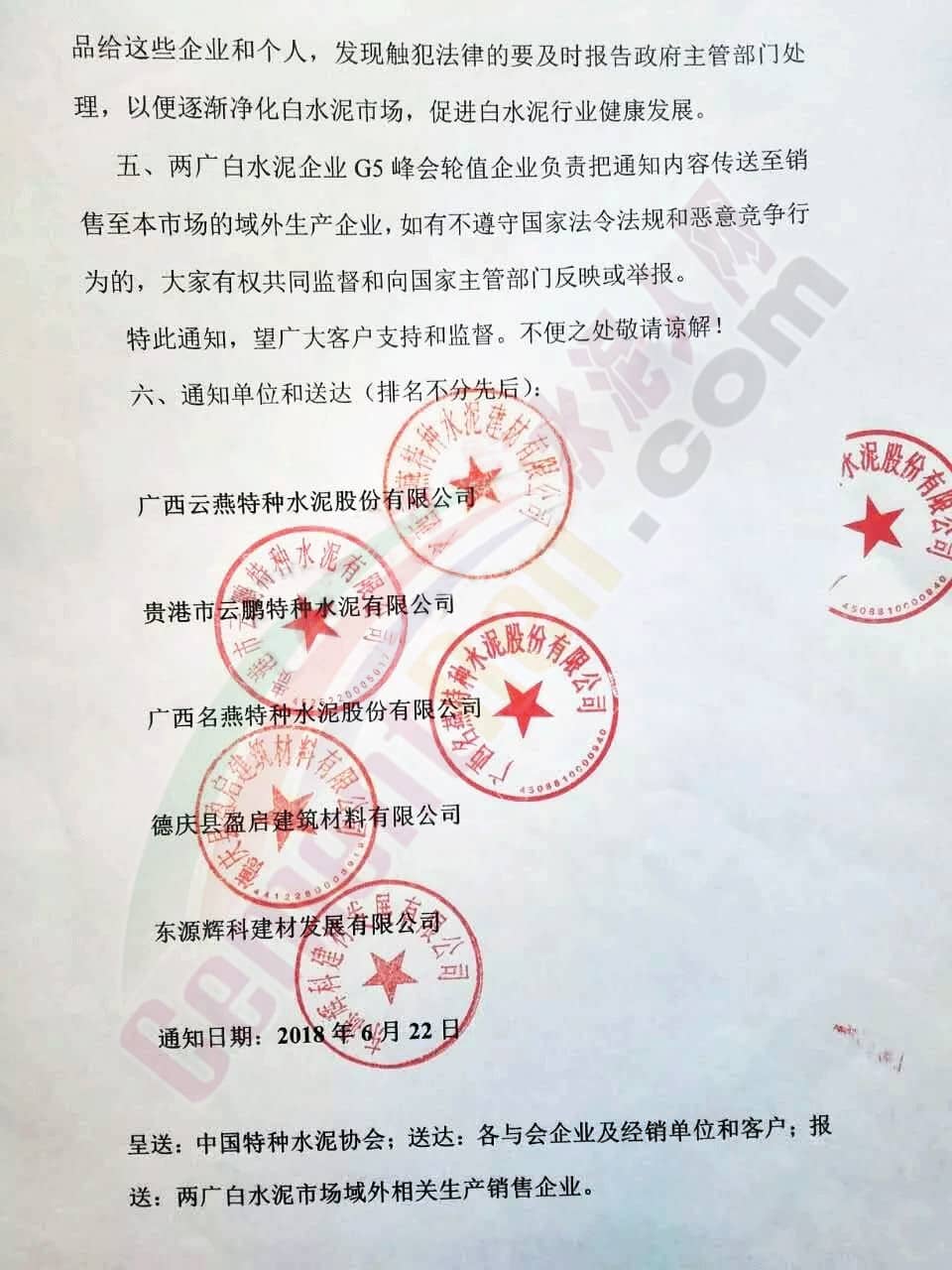 五、兩廣白水泥企業(yè)G5峰會(huì)輪值企業(yè)負(fù)責(zé)把通知內(nèi)容傳送至銷售至本市場(chǎng)的域外生產(chǎn)企業(yè),如有不遵守國家法令法規(guī)和惡意競(jìng)爭(zhēng)行訓(xùn)的,大家有權(quán)共同監(jiān)督和向國家主管部門反映或舉報(bào)。