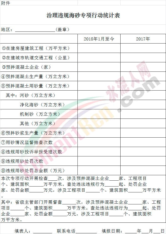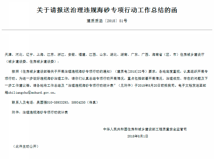 重點包括部署開展情況、治理成效、存在的問題及下一步工作建議等。上述公函要求各地將工作總結(jié)及“治理違規(guī)海砂專項行動統(tǒng)計表”于2018年8月20日前報住建部工程質(zhì)量安全監(jiān)管司。