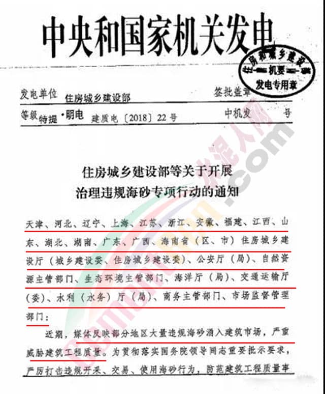 住房城鄉(xiāng)建設(shè)部等關(guān)于開展治理違規(guī)海砂專項行動的通知》(建質(zhì)電[2018]22號)原文如下: