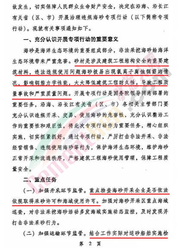 通知文件稱:近期,媒體反映部分地區(qū)大量違規(guī)海砂涌入建筑市場,嚴重威脅建筑工程質(zhì)量。為貫徹落實國務(wù)院領(lǐng)導(dǎo)同志重要批示要求嚴厲打擊違規(guī)開采、交易、使用海砂行為,防范建筑工程質(zhì)量事故發(fā)生,切實保障人民群眾生命財產(chǎn)安全,決定在沿海、沿長江有關(guān)省(區(qū)、市)開展治理違規(guī)海砂專項行動。