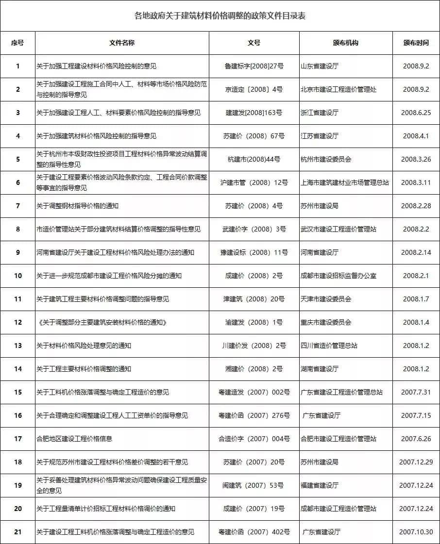 其實(shí)早在2007、2008年,因人工、材料(設(shè)備)、施工機(jī)械臺(tái)班價(jià)格等出現(xiàn)持續(xù)大幅度的漲落,全國多個(gè)省份已出臺(tái)文件就這類問題作出明確說明。大多數(shù)地區(qū),在文件中詳細(xì)列出了價(jià)差調(diào)整的幅度范圍與方法。(因時(shí)間跨度較長,下表所列文件可能部分已失效,表中列出僅作參考,不具有實(shí)際指導(dǎo)作用!)