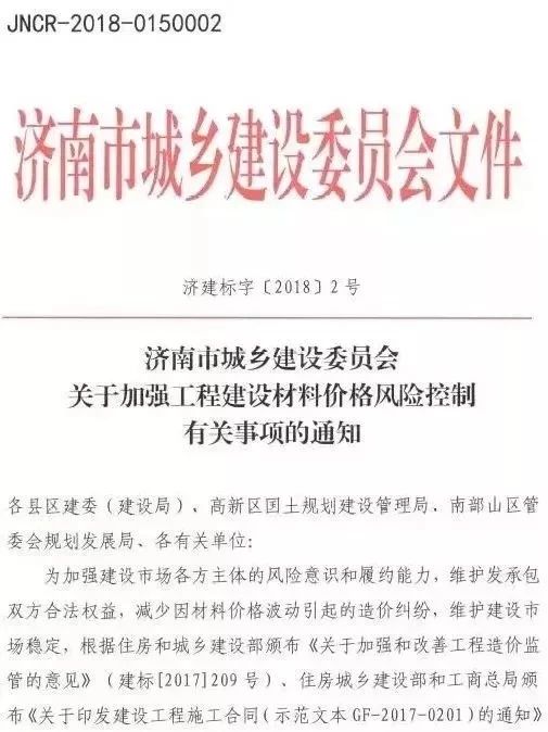 2018年1月30日,濟(jì)南市住建委印發(fā)《關(guān)于加強(qiáng)工程建設(shè)材料價(jià)格風(fēng)險(xiǎn)控制有關(guān)事項(xiàng)的通知》(濟(jì)建標(biāo)字〔2018〕2號(hào)),明確工程計(jì)價(jià)中應(yīng)推行風(fēng)險(xiǎn)共擔(dān)和合理分?jǐn)傇瓌t,承包人應(yīng)有限度承擔(dān)材料價(jià)格等市場風(fēng)險(xiǎn)。