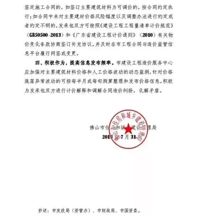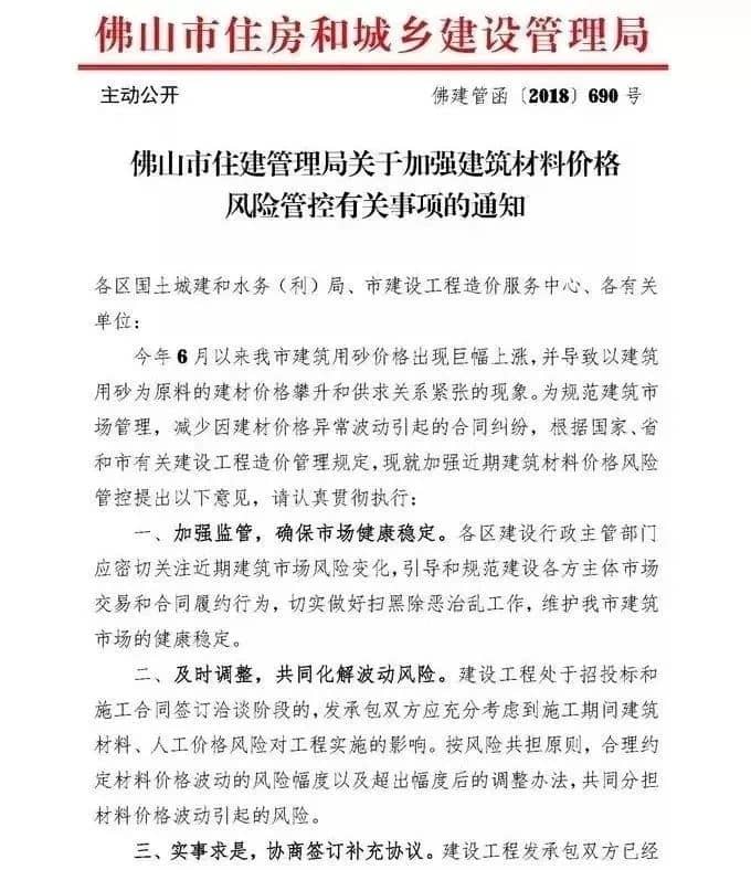 7月31日,佛山市住建管理局下發(fā)了《關(guān)于加強(qiáng)建筑材料價(jià)格風(fēng)險(xiǎn)管控有關(guān)事項(xiàng)的通知》,提出: