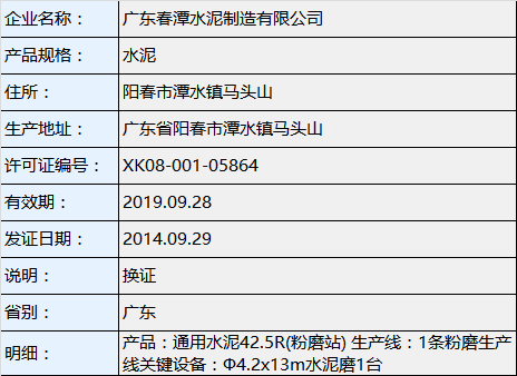 據(jù)查詢,廣東春潭水泥制造有限公司在2014年9月29日換領(lǐng)了生產(chǎn)許可證,生產(chǎn)線為1條粉磨生產(chǎn)線關(guān)鍵設(shè)備為Φ4.2x13m水泥磨1臺。