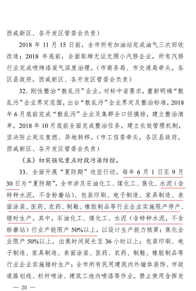 根據(jù)文件,西安市全面開(kāi)展“夏防期”攻堅(jiān)行動(dòng)。每年 6 月 1 日至 9 月 30 日為“夏防期” ,全市涉及石油化工、煤化工、焦化、水泥(含特種水泥,不含粉磨站)、包裝印刷、電子制造、家具制造、表面涂裝、醫(yī)藥、農(nóng)藥、制鞋、橡膠制品等行業(yè)企業(yè)實(shí)施限產(chǎn)停產(chǎn)、錯(cuò)時(shí)生產(chǎn)。其中,石油化工、煤化工、水泥(含特種水泥,不含 粉磨站)行業(yè)產(chǎn)能限產(chǎn) 50%以上,以設(shè)計(jì)生產(chǎn)能力核算;焦化企 業(yè)限產(chǎn) 50%以上,出焦時(shí)間延長(zhǎng)至 36 小時(shí)以上;包裝印刷、電子制造、家具制造、表面涂裝、醫(yī)藥、農(nóng)藥、制鞋、橡膠制品等行業(yè)企業(yè)實(shí)施錯(cuò)時(shí)生產(chǎn);全市所有民用建筑內(nèi)外墻體裝飾、市政道路劃線、欄桿噴涂、建筑工地內(nèi)噴漆等作業(yè),禁止使用含揮發(fā)性有機(jī)溶劑的涂料;機(jī)動(dòng)車參照“冬防期”限行辦法實(shí)施限行管控,必要時(shí)實(shí)施機(jī)動(dòng)車單雙號(hào)限行措施。