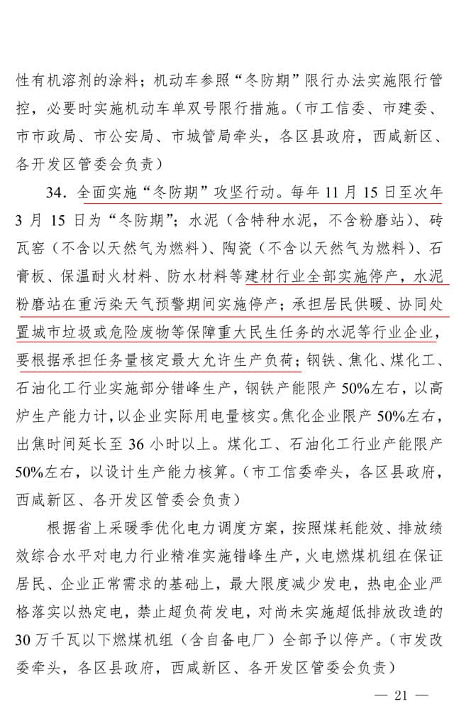 全面實(shí)施“冬防期”攻堅(jiān)行動(dòng)。每年 11 月 15 日至次年 3 月 15 日為“冬防期”;水泥(含特種水泥,不含粉磨站)、磚瓦窯(不含以天然氣為燃料)、陶瓷(不含以天然氣為燃料)、石膏板、保溫耐火材料、防水材料等建材行業(yè)全部實(shí)施停產(chǎn),水泥粉磨站在重污染天氣預(yù)警期間實(shí)施停產(chǎn);承擔(dān)居民供暖、協(xié)同處置城市垃圾或危險(xiǎn)廢物等保障重大民生任務(wù)的水泥等行業(yè)企業(yè),要根據(jù)承擔(dān)任務(wù)量核定最大允許生產(chǎn)負(fù)荷;鋼鐵、焦化、煤化工、 石油化工行業(yè)實(shí)施部分錯(cuò)峰生產(chǎn),鋼鐵產(chǎn)能限產(chǎn) 50%左右,以高 爐生產(chǎn)能力計(jì),以企業(yè)實(shí)際用電量核實(shí)。焦化企業(yè)限產(chǎn) 50%左右, 出焦時(shí)間延長(zhǎng)至 36 小時(shí)以上。煤化工、石油化工行業(yè)產(chǎn)能限產(chǎn) 50%左右,以設(shè)計(jì)生產(chǎn)能力核算。