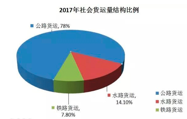 2017年我國完成社會貨運(yùn)量472.4億噸,貨運(yùn)周轉(zhuǎn)量19.3億噸,這份全球第一的貨運(yùn)成績單里,公路運(yùn)輸占78%、水路運(yùn)輸占14.1%,鐵路運(yùn)輸占7.8%。
