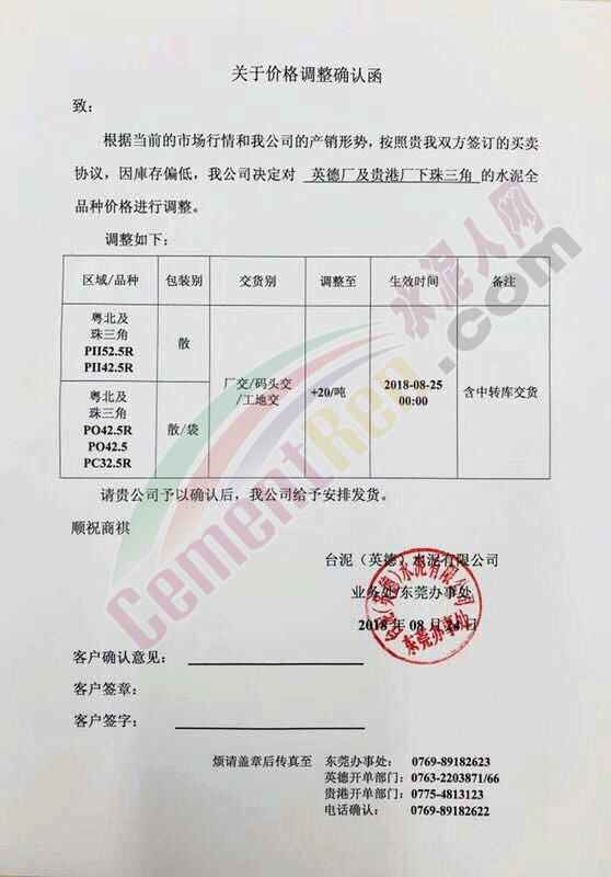 廣州市越堡水泥有限公司,廣州市珠江水泥有限公司調(diào)價確認書稱,根據(jù)目前的市場情況,從2018年8月25日零時起,公司水泥價格全區(qū)域全品種上調(diào)20元/噸。