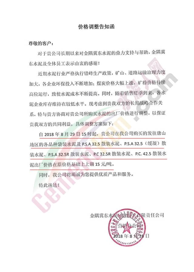 自8月29日15時起,客戶在公司購買的發(fā)往唐山地區(qū)的各品種袋裝水泥及P.S.A 32.5散裝水泥、P.S.A 32.5(緩凝)散裝水泥、P.S.A 32.5R散裝水泥、P.C 32.5R散裝水泥、P.C 42.5散裝水泥出廠價格上調(diào)15元/噸。