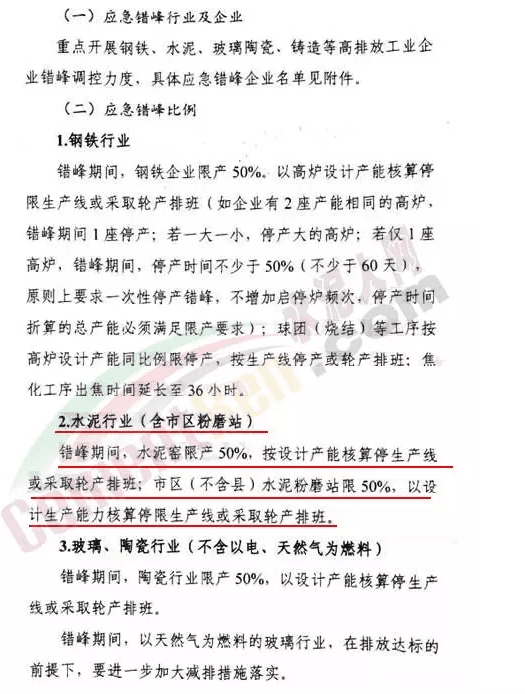 按照文件要求,2018年9月5日14:30至9月11日14:30,重點開展水泥等高排放工業(yè)企業(yè)錯峰調(diào)控力度,要求錯峰期間,水泥窯限產(chǎn)50%,按設(shè)計產(chǎn)能核算停生產(chǎn)線或采取輪產(chǎn)排班;市區(qū)(不含縣)水泥粉磨站限50%,以設(shè)計生產(chǎn)能力核算停限生產(chǎn)線或采取輪產(chǎn)排班。