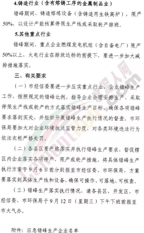 根據(jù)蕪湖市大氣污染防治聯(lián)席會辦公室日前發(fā)布的《關(guān)于執(zhí)行重點行業(yè)第一階段應(yīng)急錯峰生產(chǎn)的通知》顯示,為貫徹落實黨的十九大精神,堅決打贏藍天保衛(wèi)戰(zhàn),確??諝赓|(zhì)量持續(xù)好轉(zhuǎn),切實做好重點行業(yè)錯峰生產(chǎn)工作,結(jié)合當前環(huán)境空氣質(zhì)量形勢,蕪湖市決定對重點行業(yè)開展第一階段應(yīng)急錯峰生產(chǎn)。