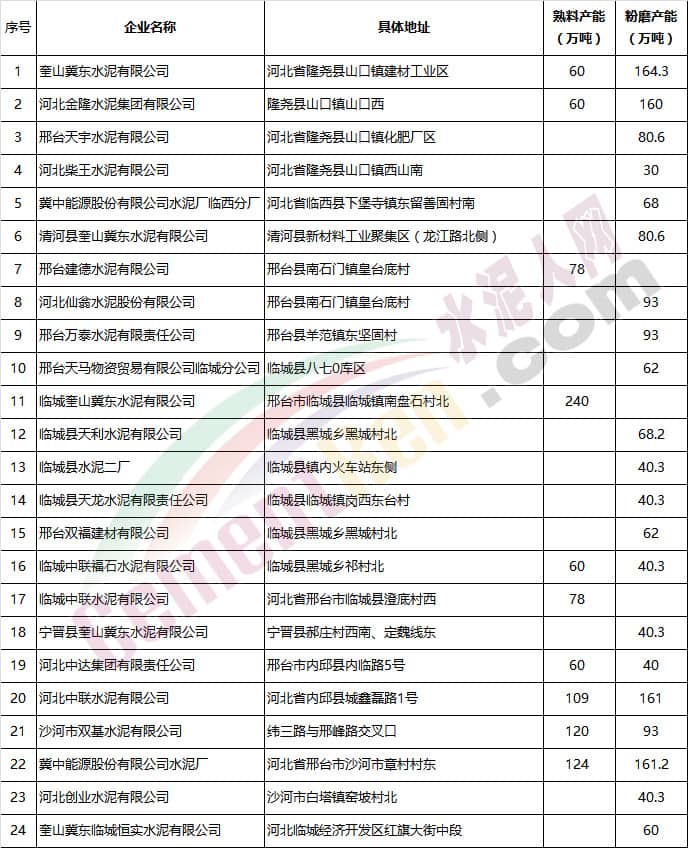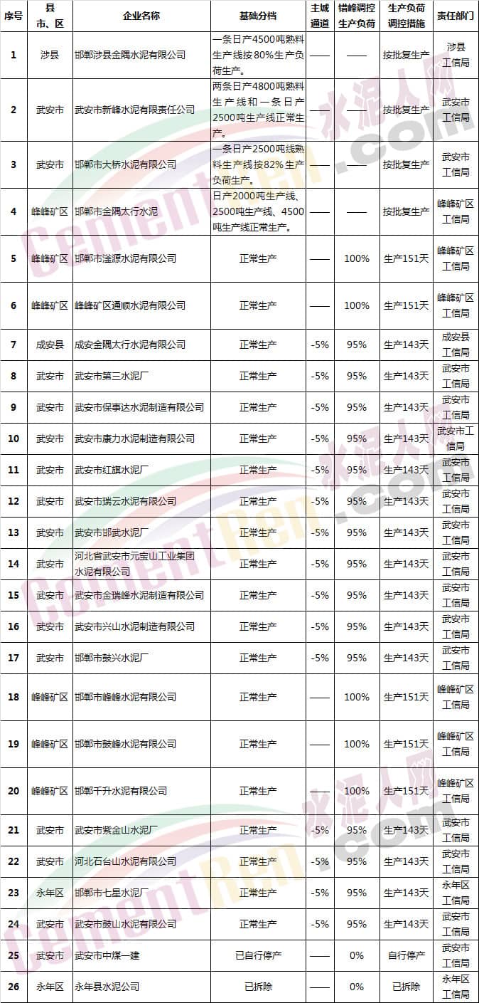(一)水泥企業(yè)(不含粉磨站)除承擔(dān)居民供暖、協(xié)同處置城市垃圾或危險(xiǎn)廢物及高速公路重點(diǎn)建設(shè)項(xiàng)目等保民生任務(wù)的,要根據(jù)承擔(dān)任務(wù)量核定最大允許生產(chǎn)負(fù)荷外,其余企業(yè)錯(cuò)峰期間全部停產(chǎn),在2018年9月底前報(bào)邯鄲市人民政府備案。水泥粉磨站按通用指標(biāo)進(jìn)行績(jī)效評(píng)價(jià),最終確定企業(yè)采暖季錯(cuò)峰生產(chǎn)方案。9月底未按標(biāo)準(zhǔn)驗(yàn)收合格的企業(yè)停產(chǎn)。