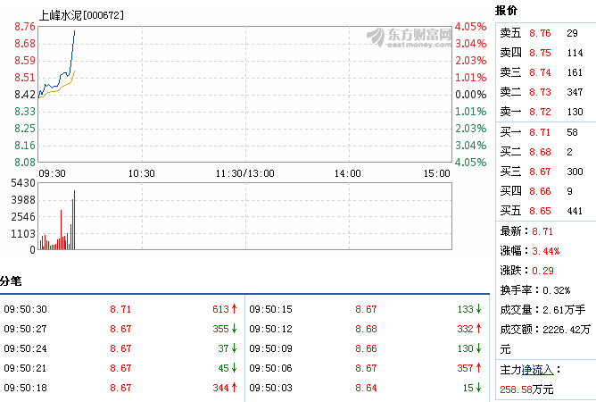 10月10日,上峰水泥盤中快速上漲,5分鐘內(nèi)漲幅超過2%,截至9點50分,報8.71元,成交2226.42萬元,換手率0.32%。