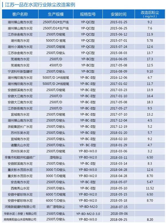 目前,該套電除塵超低排放改造技術(shù)和方案,已由江蘇一品環(huán)保在90余條水泥生產(chǎn)線上應(yīng)用和驗(yàn)證,均獲得了非常顯著的效果。實(shí)踐證明,水泥行業(yè)原有的電除塵器,只要能確保除塵器本體各項(xiàng)工況完好,并對(duì)電場(chǎng)內(nèi)部加以技術(shù)改造,配合生產(chǎn)工藝的嚴(yán)格把控,選擇合適先進(jìn)的除塵電源,使粉塵達(dá)到超低排放,完全可以實(shí)現(xiàn)!