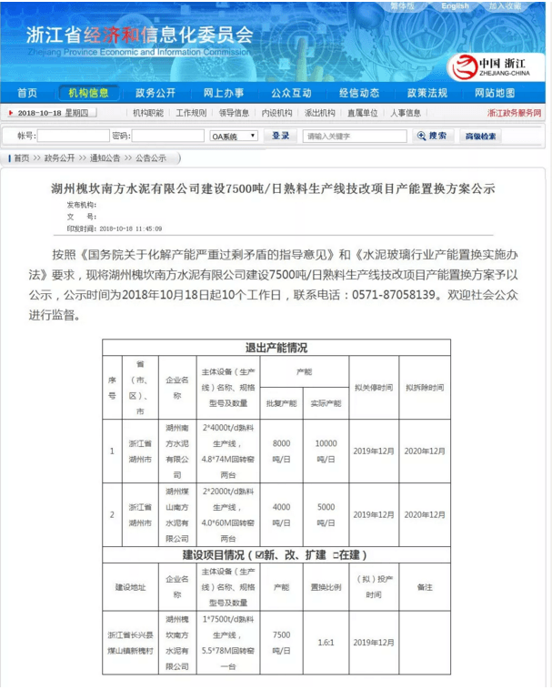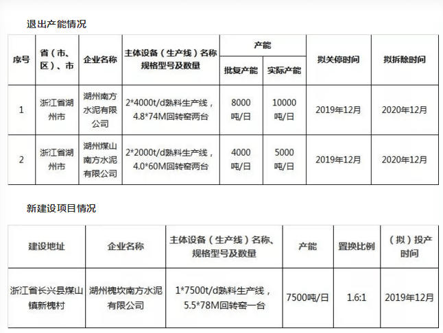 熟料生產(chǎn)線技改項目產(chǎn)能置換方案公示》。公示文件稱:按照《國務(wù)院關(guān)于化解產(chǎn)能嚴重過剩矛盾的指導(dǎo)意見》和《水泥玻璃行業(yè)產(chǎn)能置換實施辦法》要求,現(xiàn)將湖州槐坎南方水泥有限公司建設(shè)7500噸/日熟料生產(chǎn)線技改項目產(chǎn)能置換方案予以公示。公示時間為2018年10月18日起10個工作日。聯(lián)系電話:0571-87058139。歡迎社會公眾進行監(jiān)督。