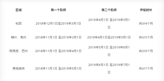 根據(jù)各地冬季采暖期、產(chǎn)能過剩和水泥市場需求情況,各地錯峰生產(chǎn)時間有所差異。為實現(xiàn)市場動態(tài)平衡,保證市場供應(yīng),全疆各區(qū)域在去年錯峰停窯的基礎(chǔ)上再增加一至一個半月錯峰停窯時間,錯峰停窯分兩個時段執(zhí)行。具體錯峰停窯時間分別為: