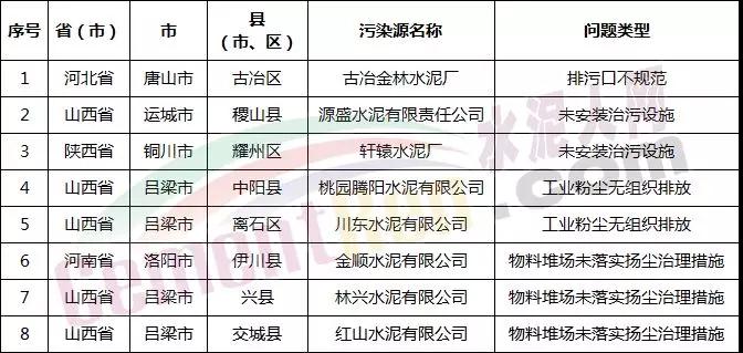 資料來源:生態(tài)環(huán)境部        據(jù)水泥人網(wǎng)了解,上述八家企業(yè)中包含一家窯磨一體全能水泥企業(yè)山西川東水泥有限公司,其問題類型為工業(yè)粉塵無組織排放。
