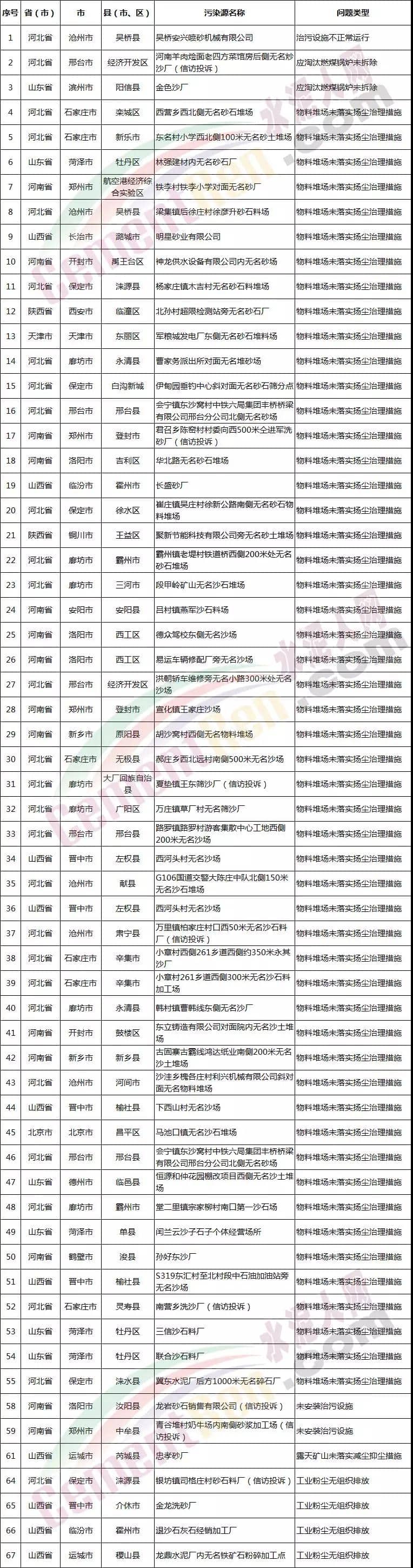 上述被查出的67起砂石料廠環(huán)境問題中,相對較突出問題也是物料堆場未落實揚塵治理措施,以及工業(yè)粉塵無組織排放問題和治污設(shè)施未安裝或運行不正常等問題。