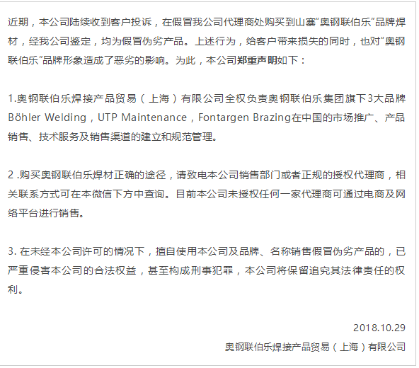 再次感謝用戶朋友對奧鋼聯(lián)伯樂焊接長久以來的信任與支持,請通過正規(guī)途徑購買奧鋼聯(lián)伯樂焊材!