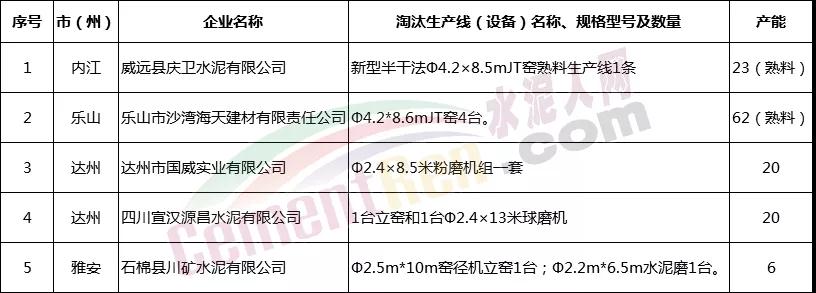 五家水泥企業(yè)分別為威遠縣慶衛(wèi)水泥有限公司、樂山市沙灣海天建材有限責任公司、達州市國威實業(yè)有限公司、四川宣漢源昌水泥有限公司、石棉縣川礦水泥有限公司。其中涉及熟料產(chǎn)能85萬噸,水泥產(chǎn)能46萬噸。