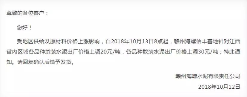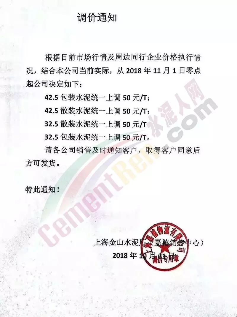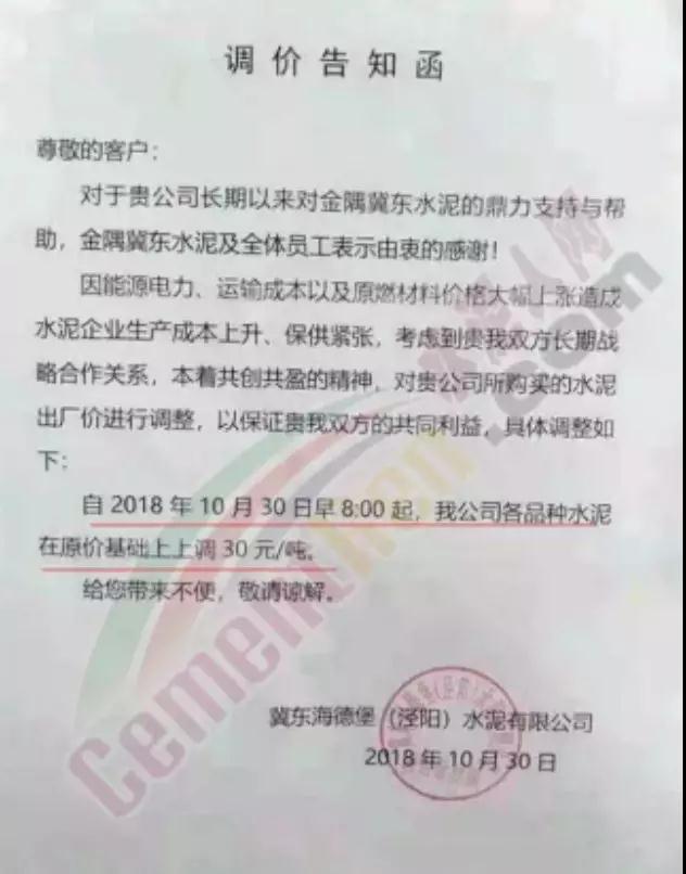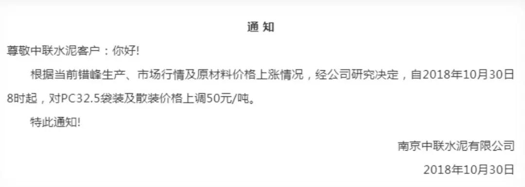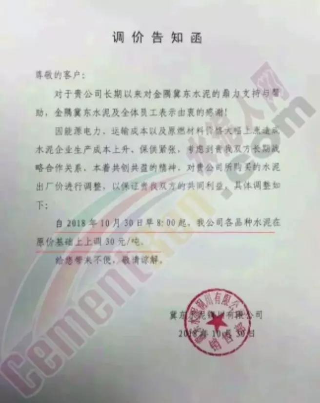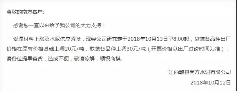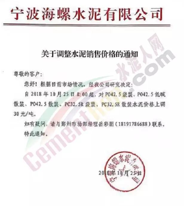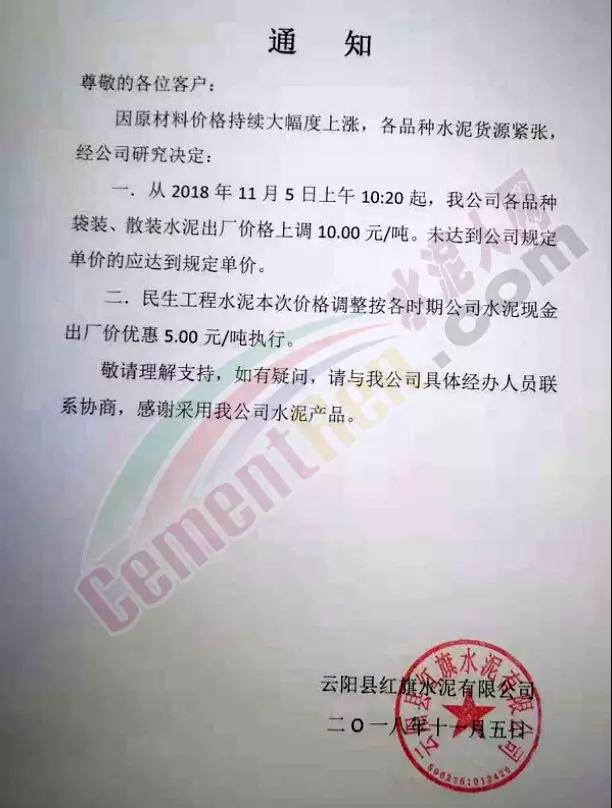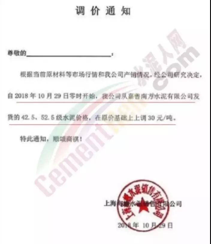 10月29日上海海螺水泥銷(xiāo)售有限公司發(fā)了一份南方水泥的漲價(jià)通知,漲價(jià)函稱經(jīng)公司研究決定自10月29日零時(shí)開(kāi)始,公司從嘉善南方水泥發(fā)貨的42.5、52.5級(jí)水泥價(jià)格,在原價(jià)基礎(chǔ)上上調(diào)30元/噸。