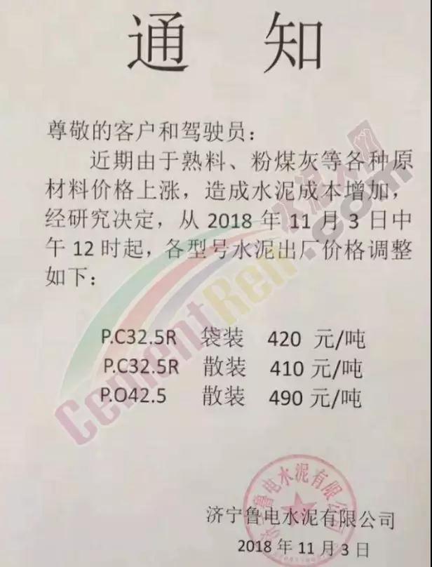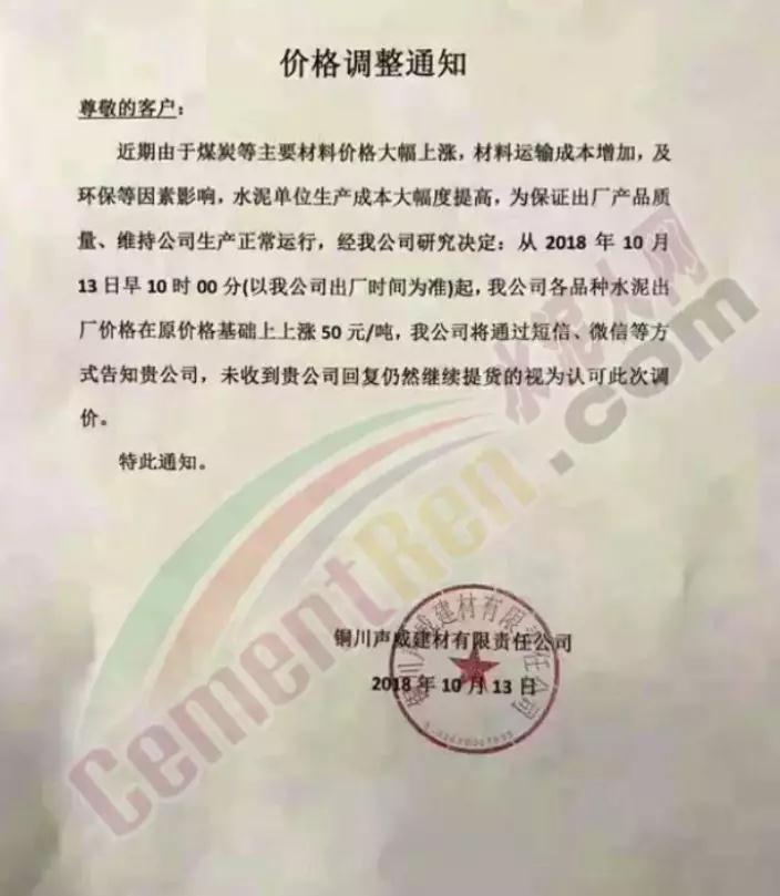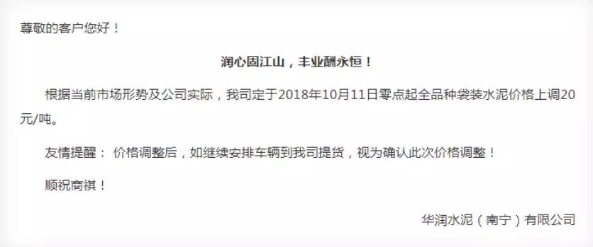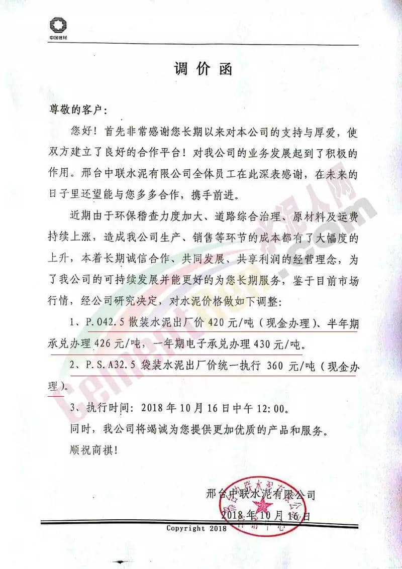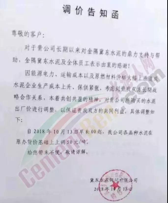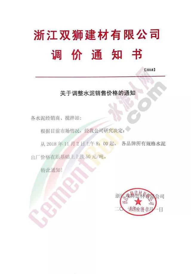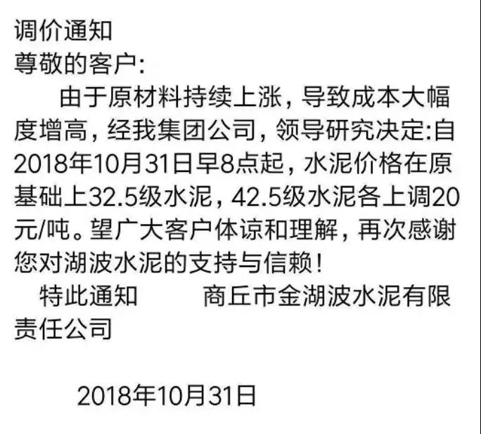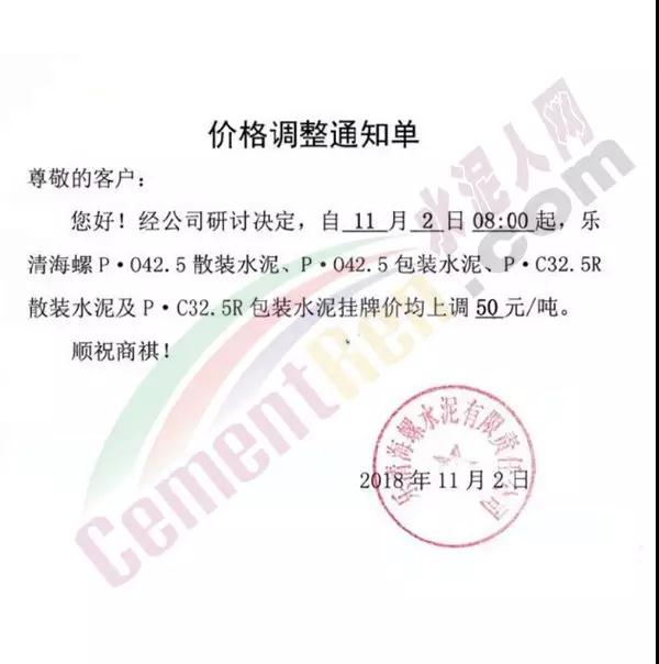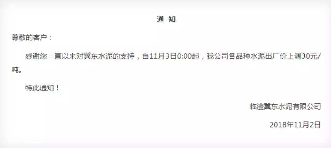 10月29日上海海螺水泥銷(xiāo)售有限公司發(fā)了一份南方水泥的漲價(jià)通知,漲價(jià)函稱經(jīng)公司研究決定自10月29日零時(shí)開(kāi)始,公司從嘉善南方水泥發(fā)貨的42.5、52.5級(jí)水泥價(jià)格,在原價(jià)基礎(chǔ)上上調(diào)30元/噸。