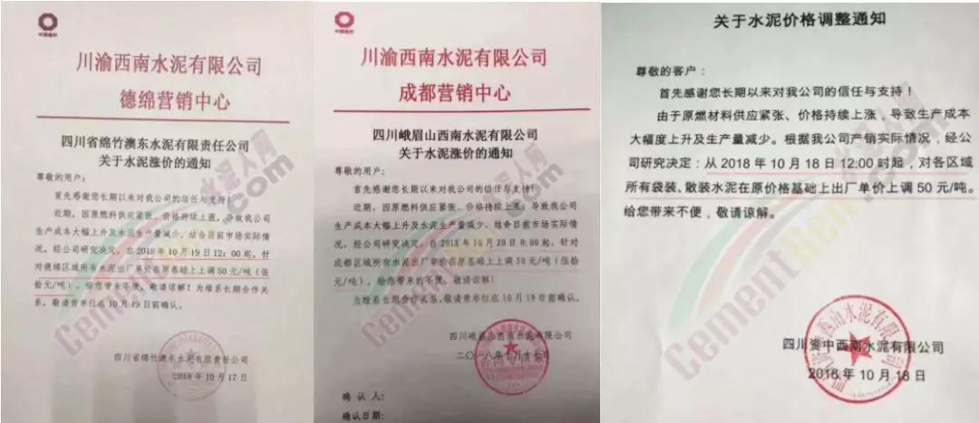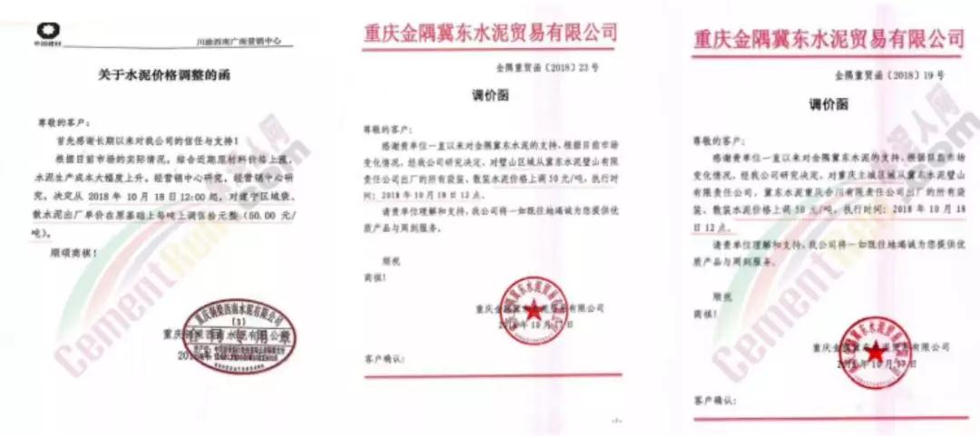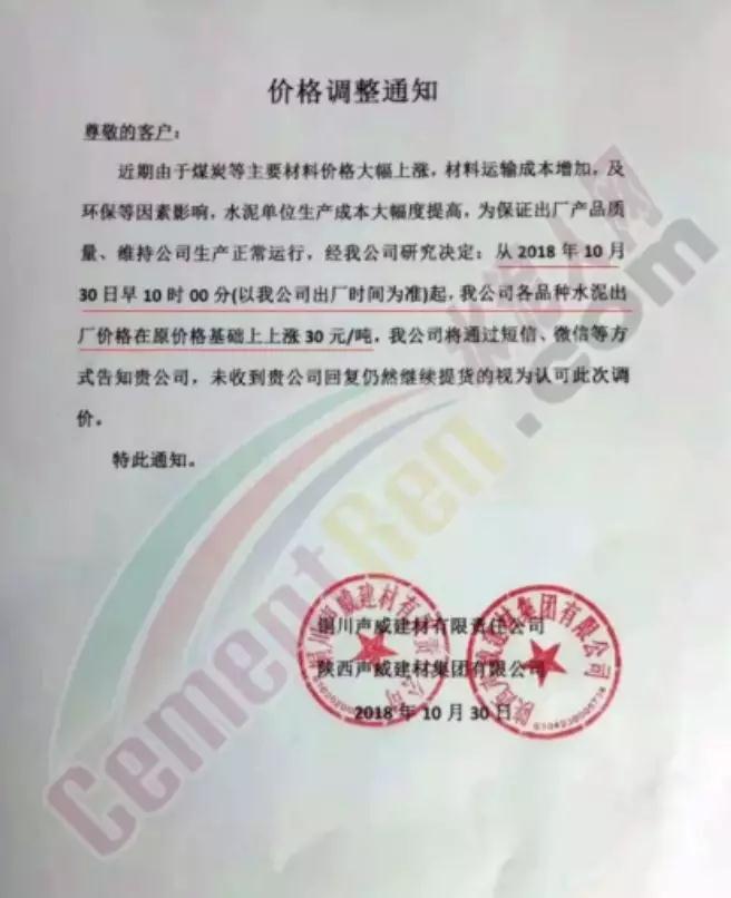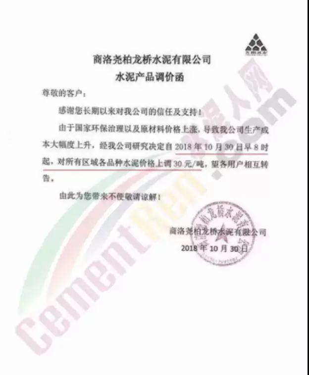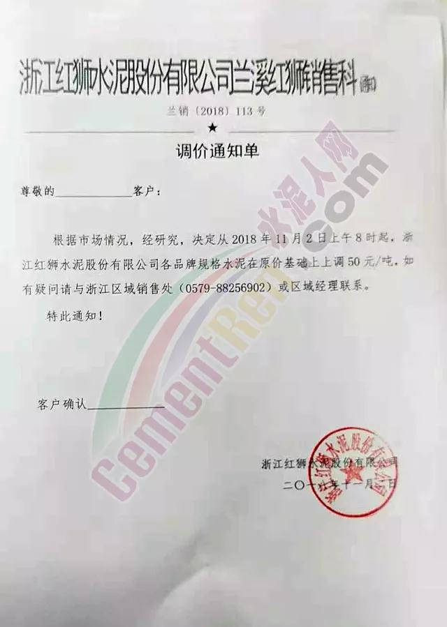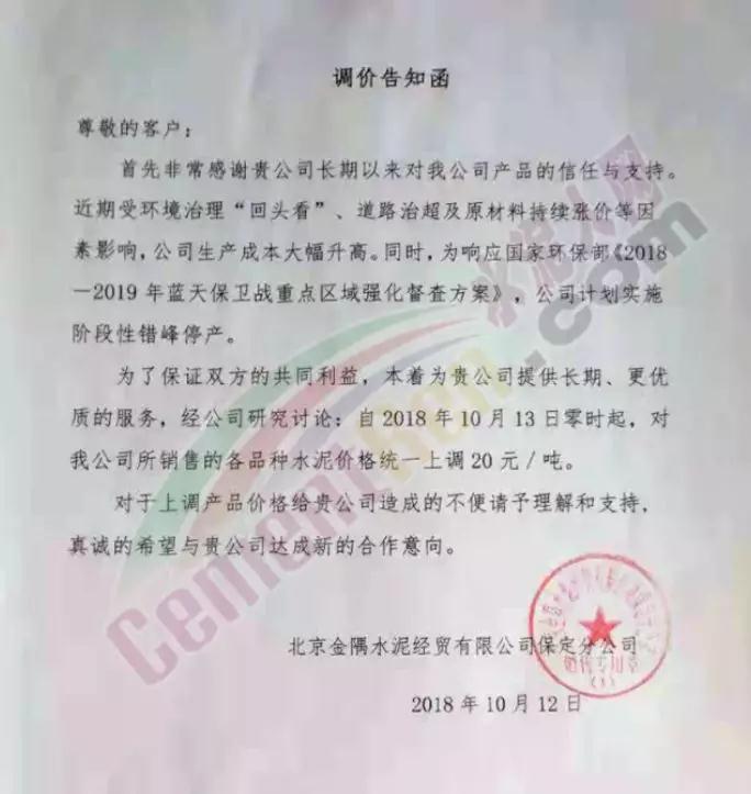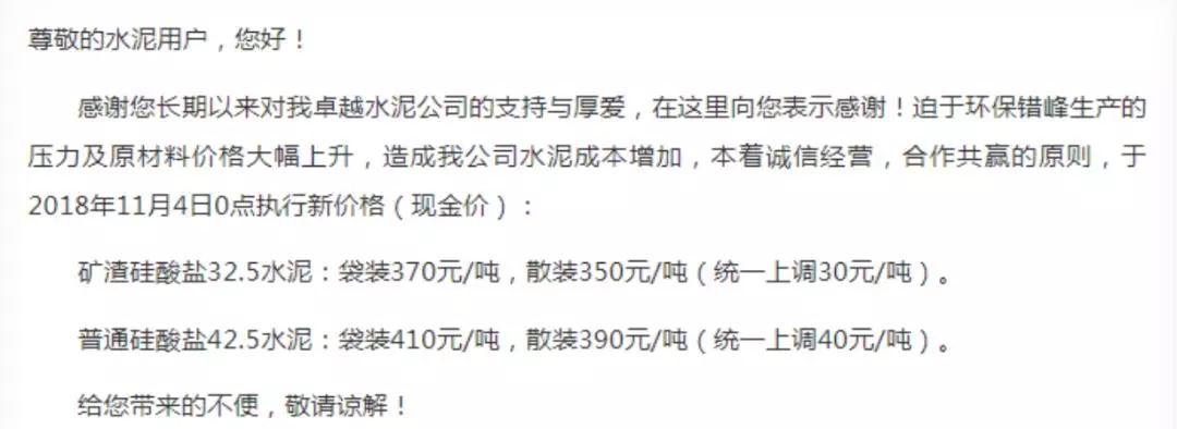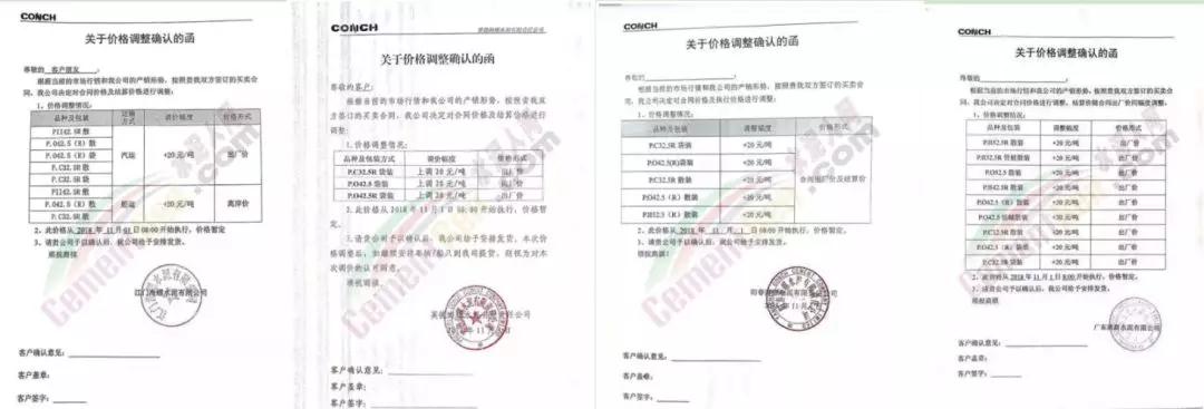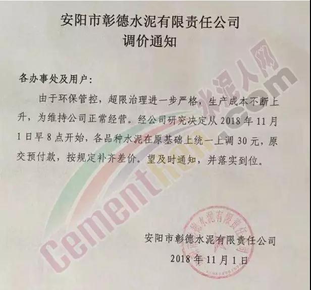 10月29日上海海螺水泥銷(xiāo)售有限公司發(fā)了一份南方水泥的漲價(jià)通知,漲價(jià)函稱經(jīng)公司研究決定自10月29日零時(shí)開(kāi)始,公司從嘉善南方水泥發(fā)貨的42.5、52.5級(jí)水泥價(jià)格,在原價(jià)基礎(chǔ)上上調(diào)30元/噸。