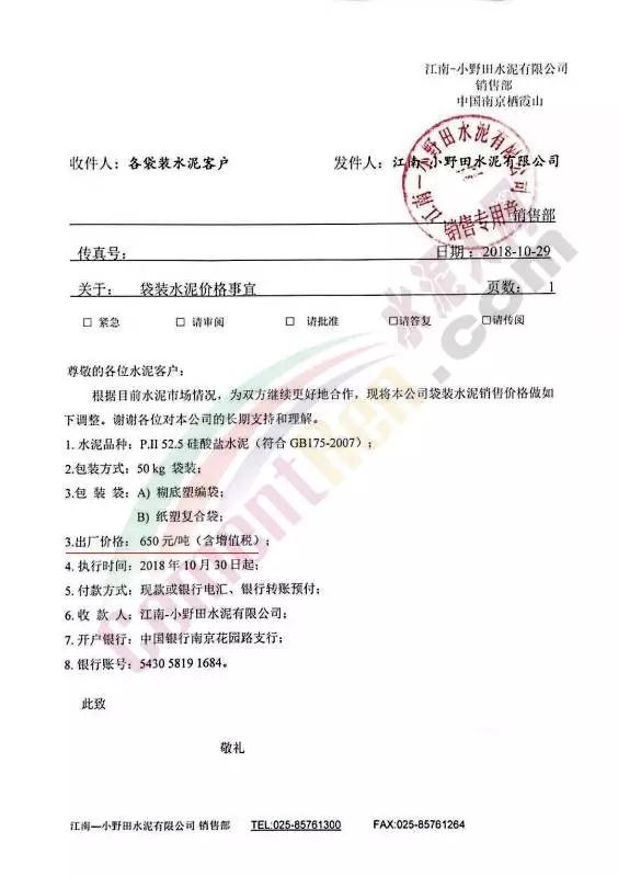自小野田水泥和南京中聯(lián)水泥宣布漲價(jià)之后,南京海中貿(mào)易公司也發(fā)布提價(jià)通知,各標(biāo)號(hào)水泥價(jià)格上調(diào)30-50元/噸,其中42.5級(jí)及以上標(biāo)號(hào)水泥在原出廠價(jià)基礎(chǔ)上上調(diào)50元/噸。