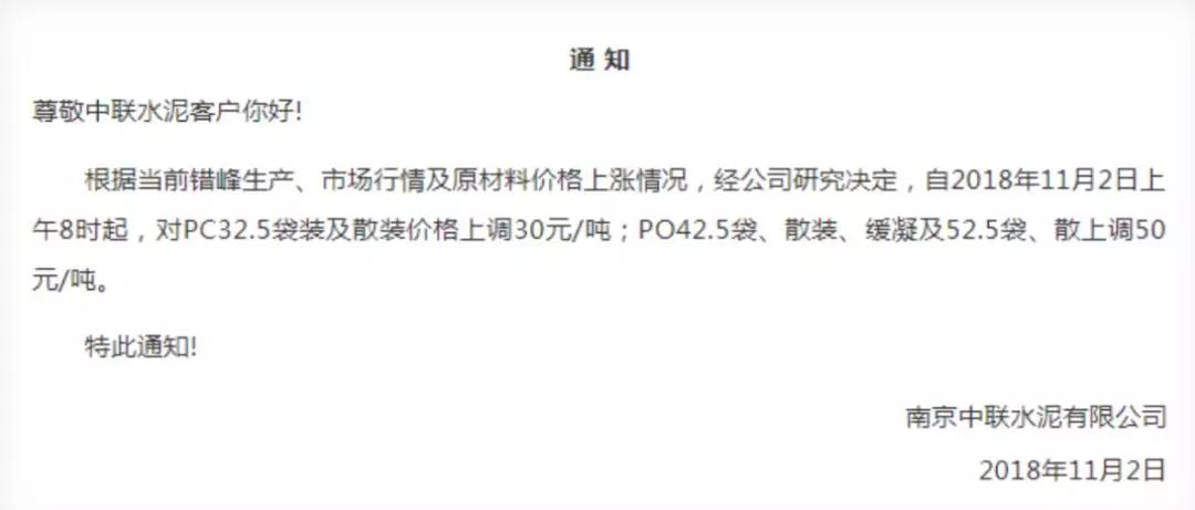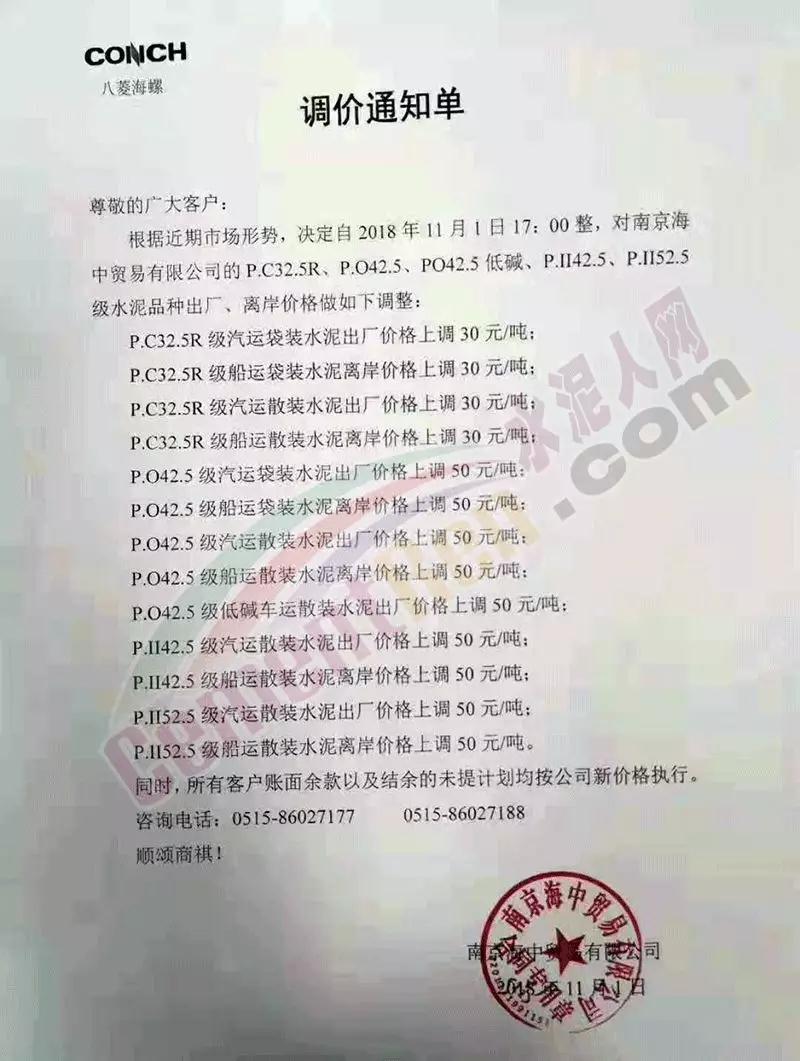 11月2日南京中聯(lián)水泥、鎮(zhèn)江北固海螺水泥上調(diào)水泥價(jià)格,其中32.5級(jí)水泥上調(diào)30元/噸。42.5級(jí)以上高標(biāo)號(hào)水泥上調(diào)50元/噸。漲價(jià)通知如下: