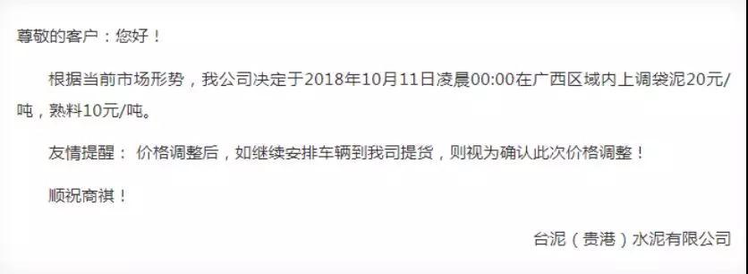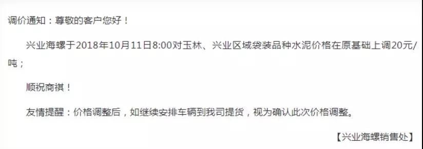 10月11日興業(yè)海螺、扶綏海螺、南寧紅獅、南寧華潤(rùn)、貴港臺(tái)泥等企業(yè)統(tǒng)一發(fā)布漲價(jià)通知,漲價(jià)幅度20元/噸。