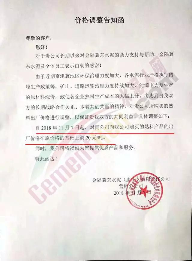 《價(jià)格調(diào)整告知函》稱,由于近期京津冀地區(qū)環(huán)保治理力度加大,各水泥行業(yè)嚴(yán)格執(zhí)行錯(cuò)峰生產(chǎn)政策。礦山、道路運(yùn)輸治理力度持續(xù)加大,能源電力及生產(chǎn)的原材料漲價(jià),致使各企業(yè)熟料生產(chǎn)成本大幅上升。 因此上調(diào)熟料出廠價(jià)格。價(jià)格調(diào)整告知函原文如下: