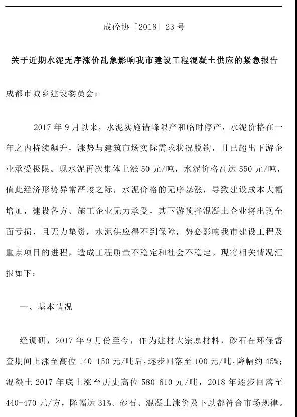 除此之外,成都市混凝土協(xié)會發(fā)布《關于近期水泥無序漲價亂象影響我市建設工程混凝土供應的緊急報告》,該文件指出成都市水泥價格持續(xù)上漲,已經(jīng)嚴重影響到了民生,懇請建委能盡快協(xié)調(diào)經(jīng)委、發(fā)改委、物價局等相關部門,保障水泥供應渠道暢通、價格合理,維護社會公平競爭環(huán)境,維護消費者利益和社會公開利益。