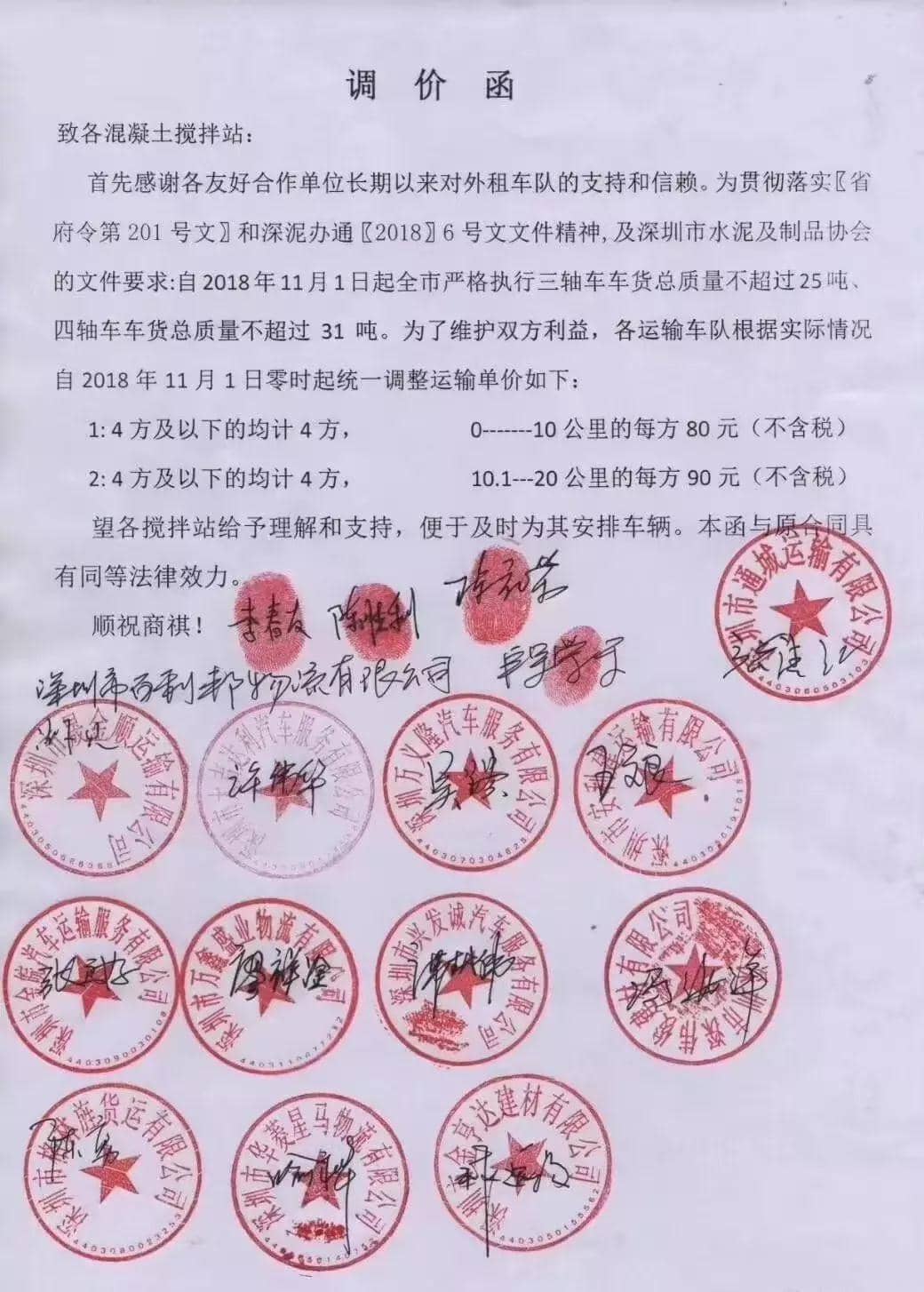 深圳市17家物流運輸公司聯(lián)名發(fā)布漲價通知稱:因為目前深圳市將嚴格執(zhí)行三軸車車貨總質(zhì)量不超25噸、四軸車車貨總質(zhì)量不超31噸。因此,將運輸單價做如下調(diào)整: