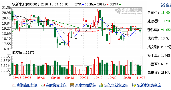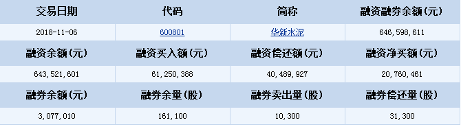 華新水泥(600801)2018-11-06融資融券信息顯示,華新水泥融資余額643,521,601元,融券余額3,077,010元,融資買入額61,250,388元,融資償還額40,489,927元,融資凈買額20,760,461元,融券余量161,100股,融券賣出量10,300股,融券償還量31,300股,融資融券余額646,598,611元。華新水泥融資融券詳細(xì)信息如下表: