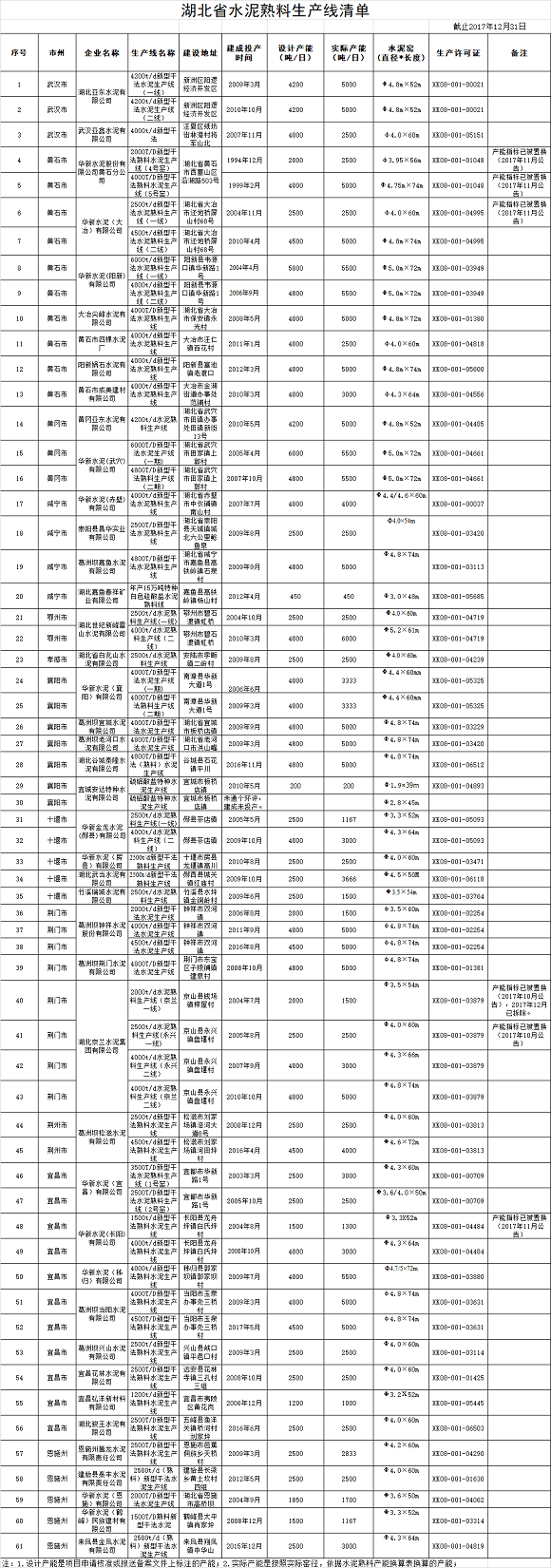 根據(jù)中國(guó)水泥網(wǎng)信息中心消息,11月5日,湖北省經(jīng)信委發(fā)布了《省經(jīng)信委關(guān)于全省水泥熟料和平板玻璃生產(chǎn)線清單的公示》。根據(jù)工業(yè)和信息化部辦公廳和國(guó)家發(fā)展改革委辦公廳《關(guān)于嚴(yán)肅產(chǎn)能置換嚴(yán)禁水泥平板玻璃行業(yè)新增產(chǎn)能的通知》(工信廳聯(lián)原[2018]57號(hào))及工信部《關(guān)于更新并公開(kāi)水泥平板玻璃生產(chǎn)線清單的函》(工信函[2018]382號(hào))的有關(guān)要求,我委組織開(kāi)展了水泥熟料、平板玻璃生產(chǎn)線清單更新工作?,F(xiàn)將我省更新的水泥熟料、平板玻璃生產(chǎn)線清單予以公示。清單內(nèi)顯示共61條水泥熟料生產(chǎn)線。