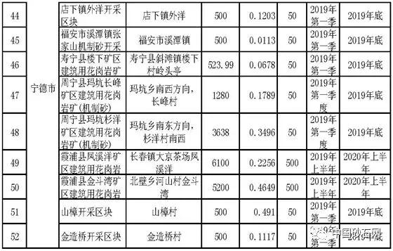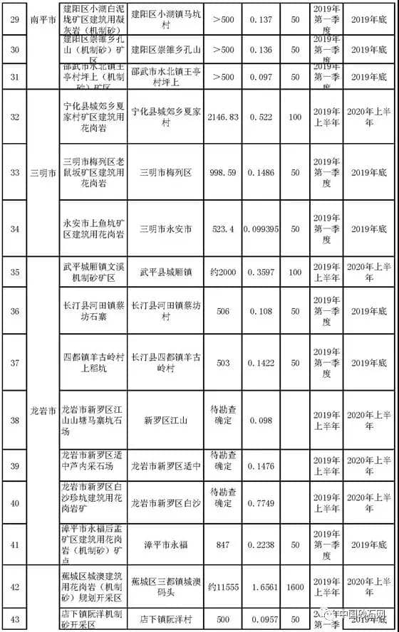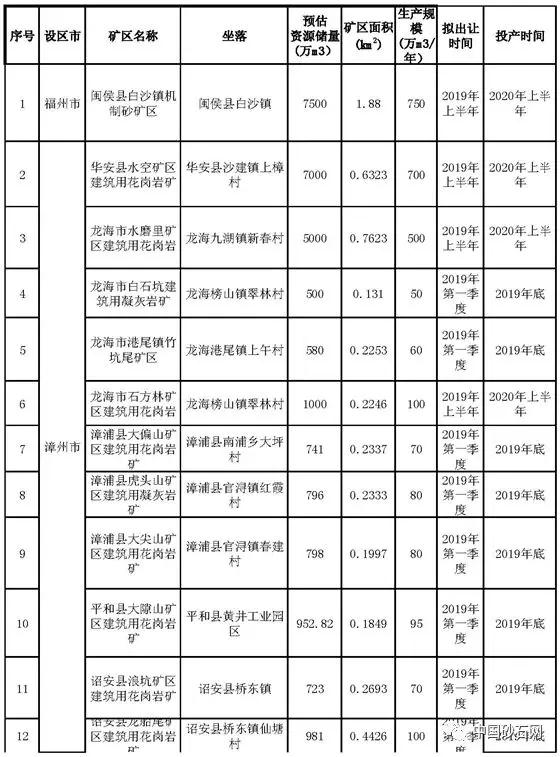 今天,《福建省國(guó)土資源廳 福建省住房和城鄉(xiāng)建設(shè)廳關(guān)于加快推進(jìn)機(jī)制砂項(xiàng)目配套礦山采礦權(quán)出讓工作的通知》在福建省自然資源廳網(wǎng)站公示。其中附件中有:《各設(shè)區(qū)市擬設(shè)機(jī)制砂項(xiàng)目配套礦山基本情況一覽表》,一共有52家機(jī)制砂礦區(qū),投產(chǎn)時(shí)間段在2019年到2020年之間。