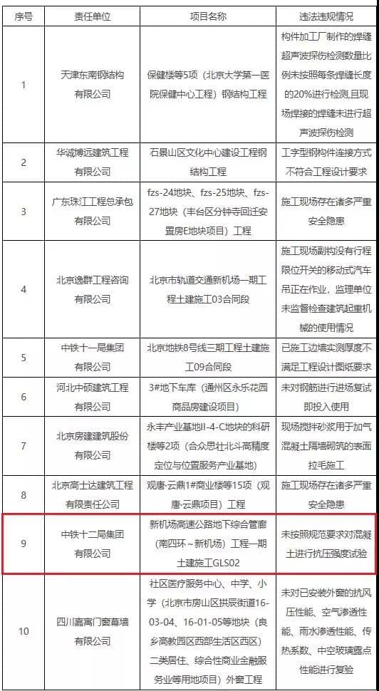 日前,北京市住房城鄉(xiāng)建設(shè)委集中通報(bào)10家安全質(zhì)量違法違規(guī)企業(yè),其中新機(jī)場(chǎng)高速公路地下綜合管廊(南四環(huán)~新機(jī)場(chǎng))工程一期土建施工GLS02 因未按照規(guī)范要求對(duì)混凝土進(jìn)行抗壓強(qiáng)度試驗(yàn)被通報(bào),項(xiàng)目責(zé)任單位為中鐵十二局集團(tuán)有限公司。