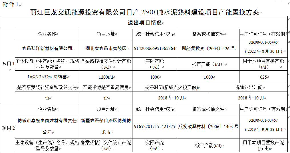 附件:1.麗江巨龍交通能源投資有限公司日產(chǎn)2500噸水泥熟料建設(shè)項(xiàng)目產(chǎn)能置換方案