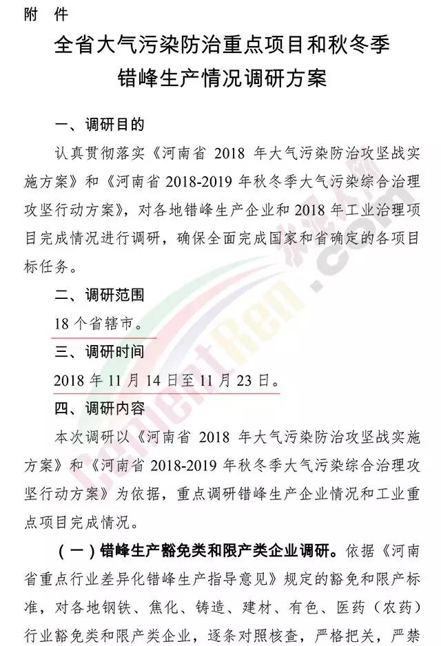 日前河南省發(fā)布《全省大氣污染防治重點項目和秋冬季錯峰生產(chǎn)情況調(diào)研方案》(以下簡稱“方案”)?!斗桨浮贩Q此次調(diào)研目的是認真貫徹落實《河南省2018年大氣污染防治攻堅戰(zhàn)實施方案》和《河南省2018-2019年秋冬季大氣污染綜合治理攻堅方案》,對各地錯峰生產(chǎn)企業(yè)和2018年工業(yè)治理項目完成情況進行調(diào)研,確保全面完成國家和河南省確定的各項目標任務。調(diào)研時間為2018年11月14日至11月23日。