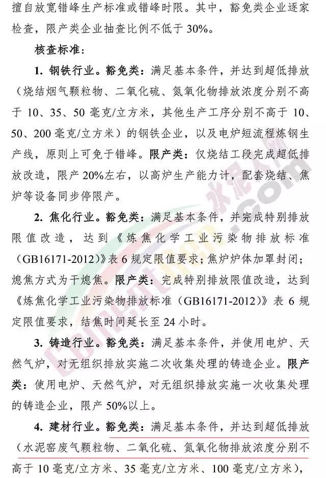 調(diào)研內(nèi)容包括錯峰生產(chǎn)豁免類和限產(chǎn)類企業(yè)的調(diào)研。依據(jù)《河南省重點行業(yè)差異化錯峰生產(chǎn)指導意見》規(guī)定的豁免和限產(chǎn)標準,對各地建材、鋼鐵、焦化等行業(yè)豁免類和限產(chǎn)類企業(yè),逐條對照核查,嚴格把關,嚴禁擅自放寬錯峰生產(chǎn)標準或錯峰時限。其中豁免類企業(yè)逐家檢查,限產(chǎn)類企業(yè)抽查比例不低于30%。