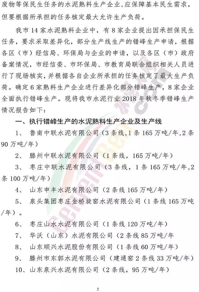 棗莊市水泥行業(yè)2018年秋冬季錯峰生產(chǎn)情況